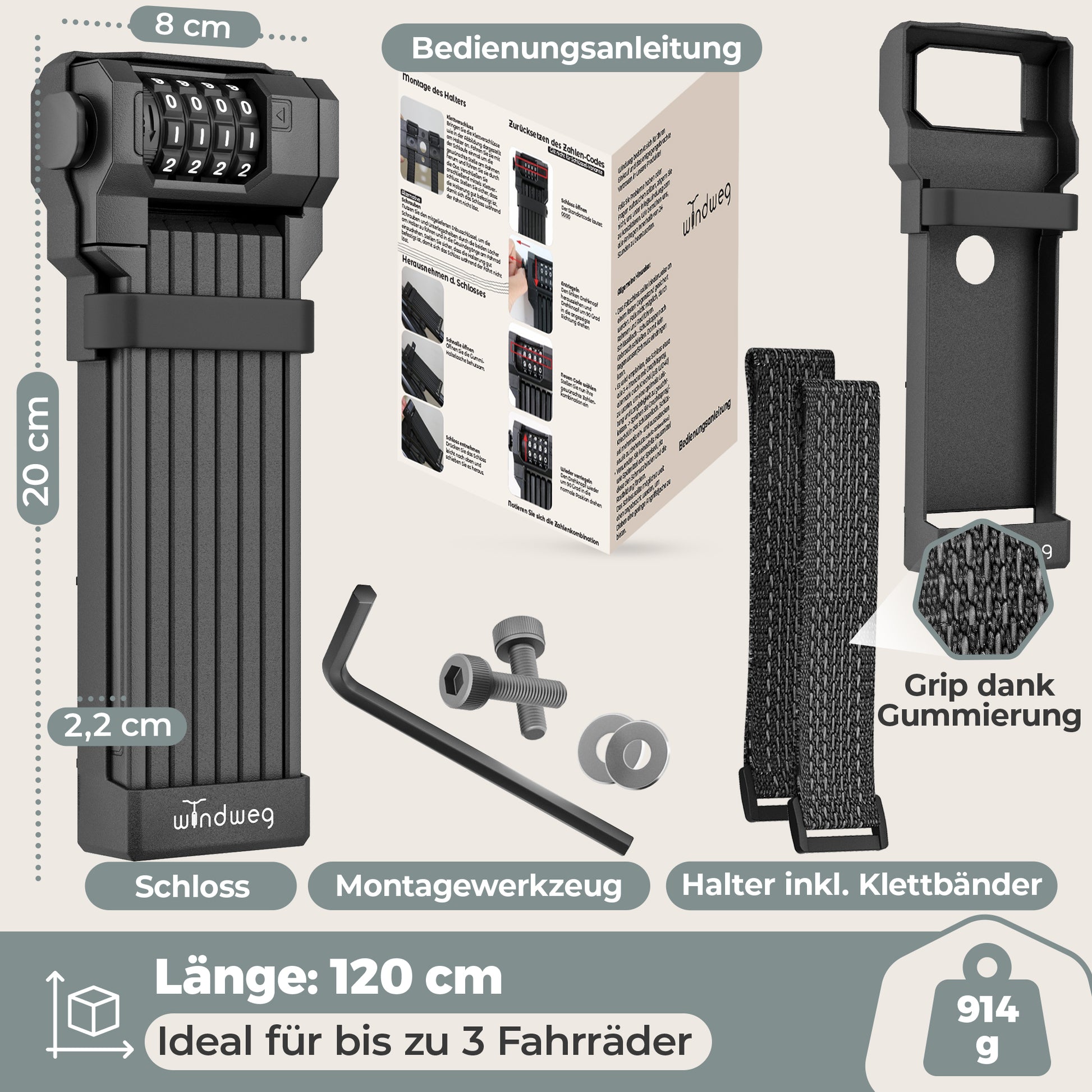 • Windweg XL Zahlenschloss: Hochsicheres Faltschloss mit Zahlencode, Anti-Bohrschutz und 120 cm Länge. Ideal für urbane Zonen und tägliche Nutzung ohne Schlüssel.