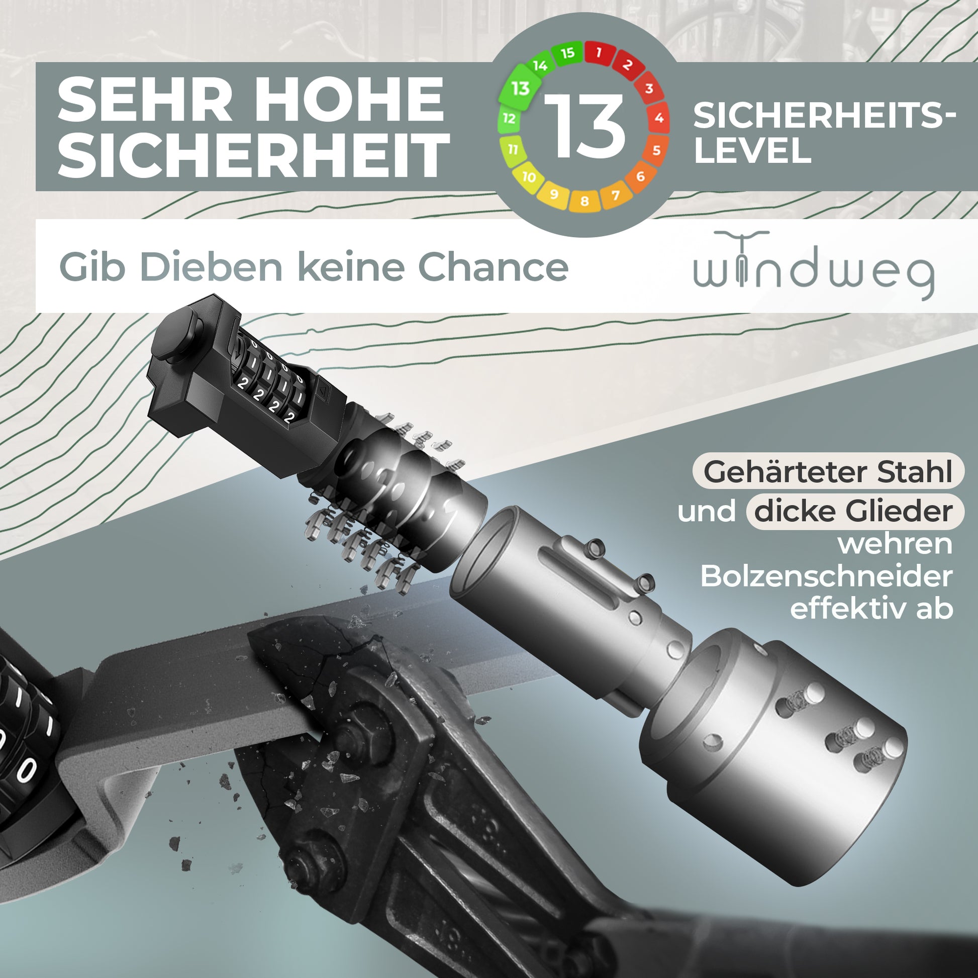 Die Königsklasse unter den Windweg-Schlössern: 120 cm, Zahlenschloss, maximale Flexibilität & höchste Sicherheit – ohne Schlüssel, ohne Kompromisse.